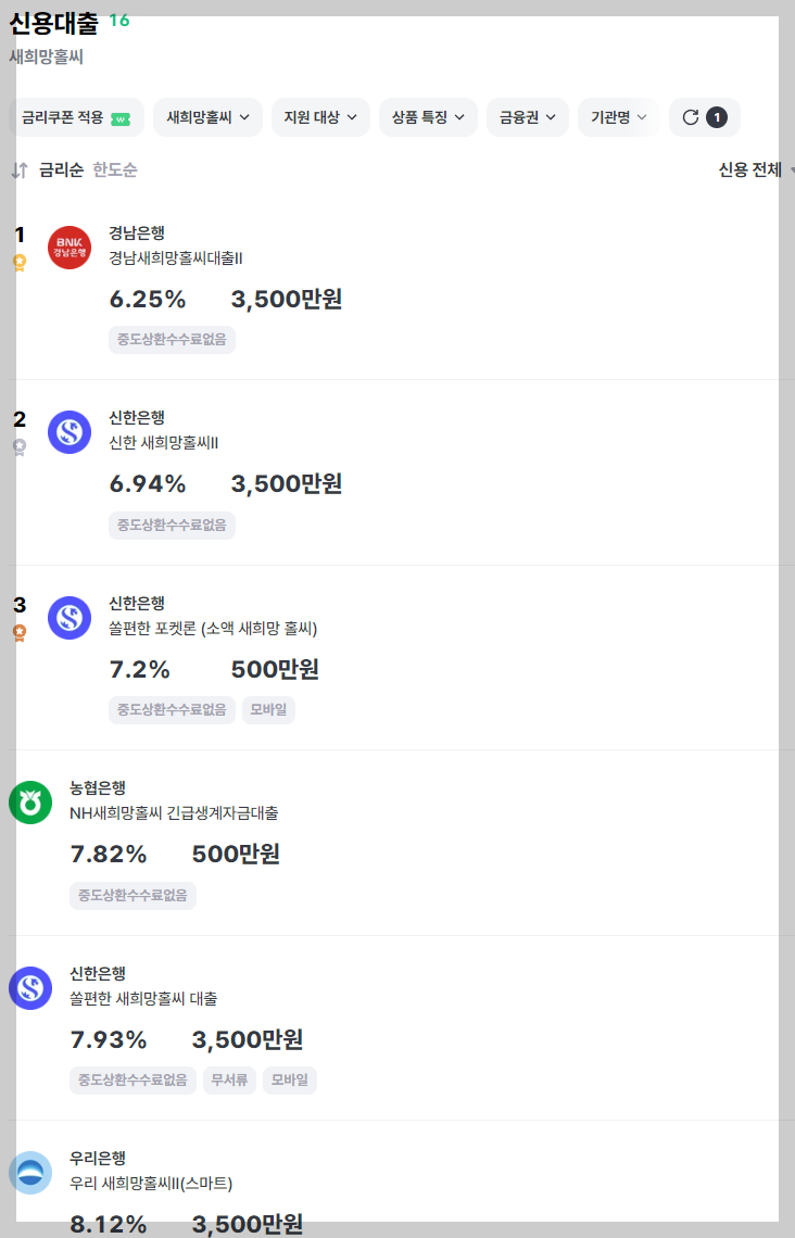 기본 정보만 기입하면 은행별 금리와 금액을 한눈에 비교해서 보실 수 있습니다. 위 버튼을 누르고 들어가셔서 한번 해보시면 손쉽게 새희망홀씨 상품을 활용하실 수 있을 겁니다.