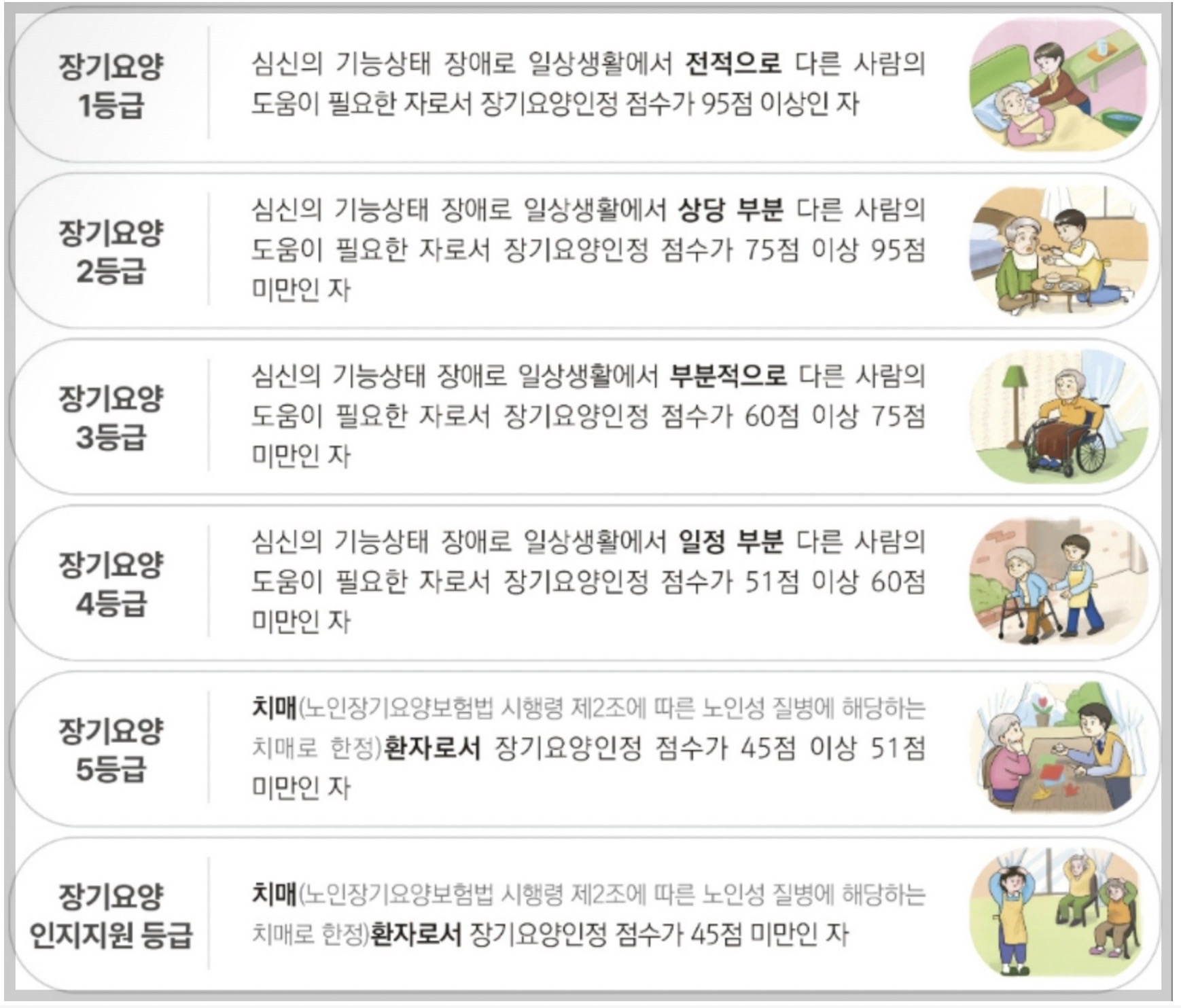 심신의 상태와 치매 정도에 따라 장기요양 등급이 결정된 위 표를 보고 확인해 보시길 바랍니다.