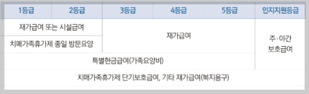 장기요양 등급에 따라 급여 종류가 달라지며 재가급여의 경우는 위 표와 같이 3~5등급에 해당됩니다.