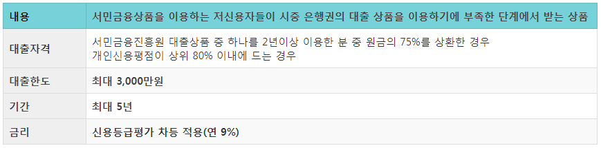 서민금융상품을 이용하는 저신용자들이 시중 은행권의 대출 상품을 이용하기에 부족한 단계에서 받을 수 있는 상품입니다.