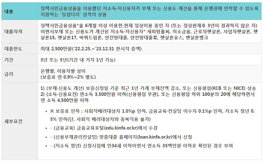 정책서민금융상품을 이용했던 저소득,저신용자가 부채 또는 신용도 개선을 통해 은행권에 안착할 수 있도록 지원하는 '징검다리' 성품의 상품입니다.