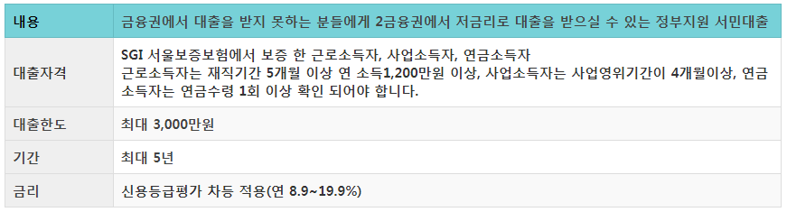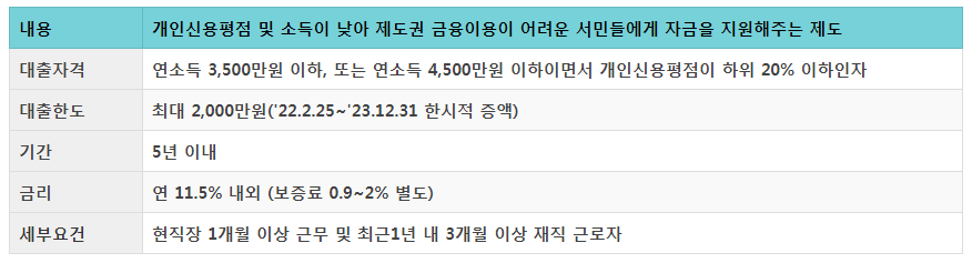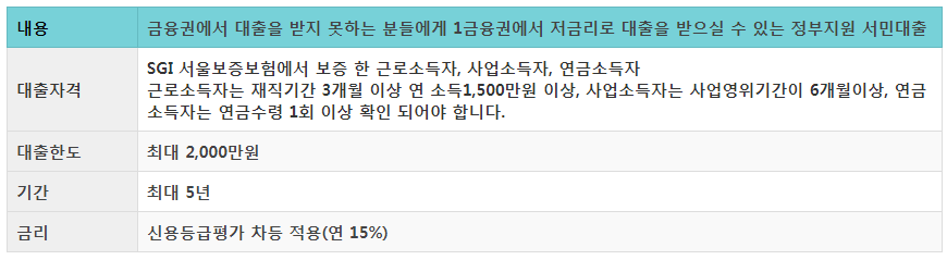 개인신용평점 및 소득이 낮아 제도권 금융이용이 어려운 서민들에게 자금을 지원해주즌 제도입니다.