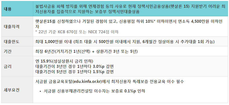 불법사금융 피해 방지를 위해 연체경험 등의 사유로 현재 정책서민금융상품(햇랄론15) 지원받기 어려운 최저신용자를 집중적으로 지원하는 보증부 정책서민상품 입니다.